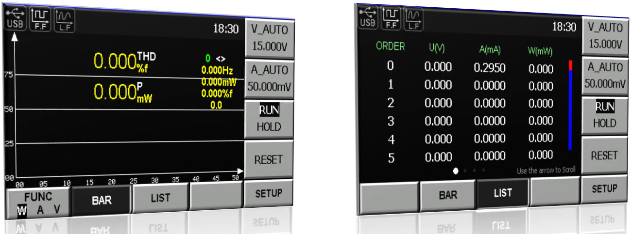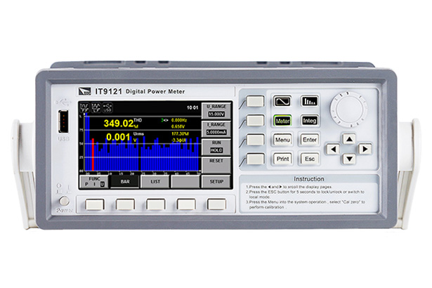 The IT9121 power meter has a bandwidth of 100KHz, which can realize high-speed harmonic measurement within a wider dynamic range. In the harmonic mode, the voltage, the current, the active power, reactive power and phase of each harmonic and the factor of total harmonic distortion (THD) can be tested.