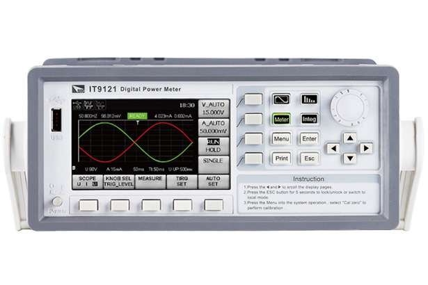 The IT9100 power meter can provide the maximum input of 1000 Vrms and 50 Arms and measurement bandwidth of 100 kHz, and can be easily used for measuring thevoltage, current, power, frequency, harmonics and other parameters. The standard configuration includes USB, RS232 and LAN communication interfaces and also interfaces for USB-based peripheral devices. Users can save the measured parameters into the external storage medium. The basic voltage and current accuracy is 0.1%. Moreover, the power meter has rich integrating functions, such as the active power. It is widely applied in test of motors, household appliances, UPS, etc.